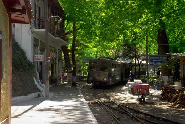 The hotel overlooks the railroad, in fact, it is practically on top of the railroad. Sounds like a railfan's paradise. 8 trains a day. Except it is the same train, 8 times! Still, the restaurant is nice, and Zachlorou is worth a walk. This photo looks south west. The train is coming down the mountain, heading towards Diakofto. The steep walking path to Mega Spilieo monastery starts behind the hotel at the far end, just about where the train is. The main part of the town of Zachlorou is off to the right. I did not go inside the hotel, so I can't tell you about it. |