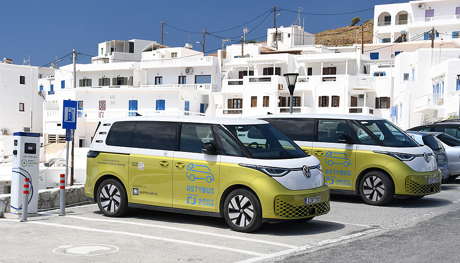The Astybus is for public transit, airport runs, etc. However, it doesn't hold that many people, especially if they have luggage. The Kallichorn hotel is in the background above the right-hand Asybus.
